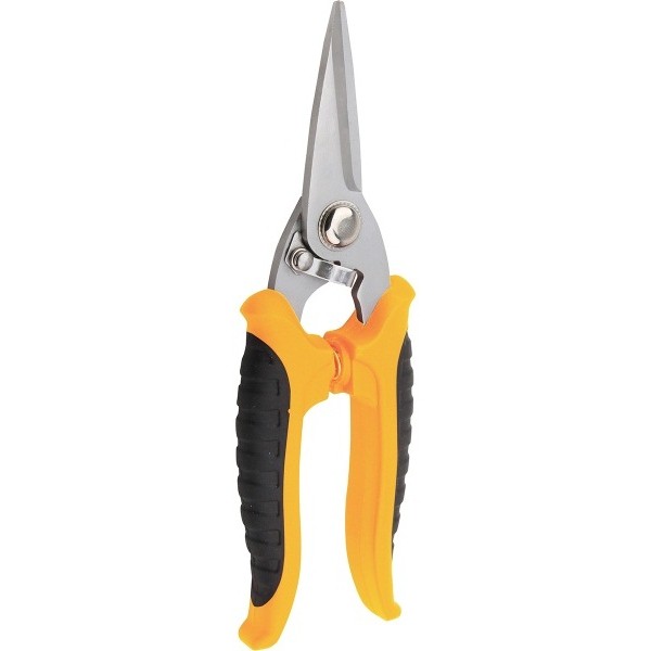 Универсальные ножницы длиной 185 мм - инструмент для разрезания тонкого металла и мягких материалов. Одно из лезвий имеет серрейторную (зубчатую) заточку, поэтому разрезаемый материал не выскальзывает из инструмента. Ножницы подходят для выполнения разнообразных работ.