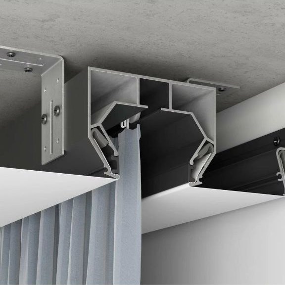 Представляет собой черную или белую конструкцию, формирующую нишу со встроенной однорядной направляющей в виде прямой или г-образной линии. Монтируется на базовый потолок, как правила, от стены до стены, но имеет возможность установки без примыкания к стенам за счет использования торцевых декоративных заглушек, замыкающих профиль. Является прекрасным решением для разделения жилой комнаты однорядным карнизом для штор: отделить спальное место в студии или в однокомнатной квартире. использование как шторы для душа, либо зонирования ванной комнаты.