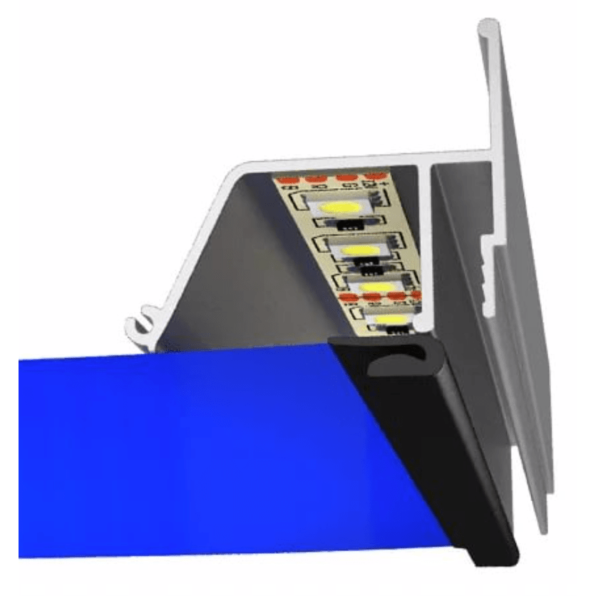 Стеновой контурный профиль для наатяжных потолков с гарпунной системой крепления полотна. С полкой для светодиодной ленты для подсветки через полотно, направленной вниз. По периметру профиль закрывается стеновой вставкой. Профиль используется для создания потолков с подсветкой по периметру. Светодиодная LED лента устанавливается на полку профиля, есть возможность установки ленты в два ряда. Благодаря натянутой ПВХ пленке поверх паза профиля, светодиоды становятся невидимыми. Тем самым получается чёткая, ровная подсветка по контуру.